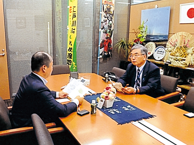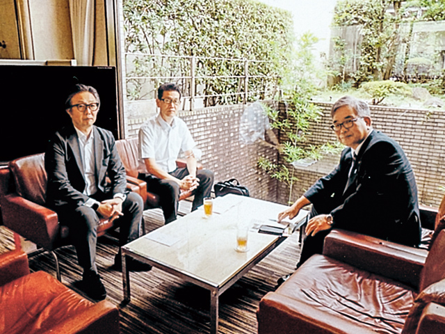 出身大学の後藤総合企画部長(手前)、建部院友会本部総務課長(奥)と観光産業と大学との連携等について打合せをしています。