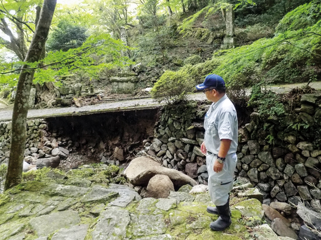 令和7年8月の台風10号被害の現地確認調査。農地や市道、河川等を中心に被災状況を確認しました。写真は安岐町両子寺の被災現場。
